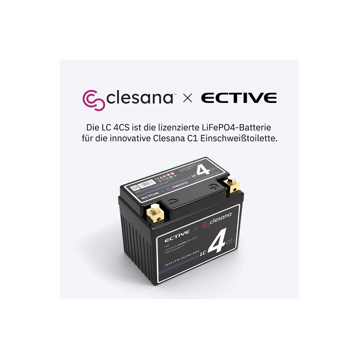 LC 4CS – Batteria con licenza ufficiale per il tuo WC Clesana. La batteria LC 4CS LiFePO4 è stata sviluppata appositamente per l'innovativo WC a saldare Clesana C1 ed è l'unica batteria di alimentazione con licenza ufficiale sul mercato.